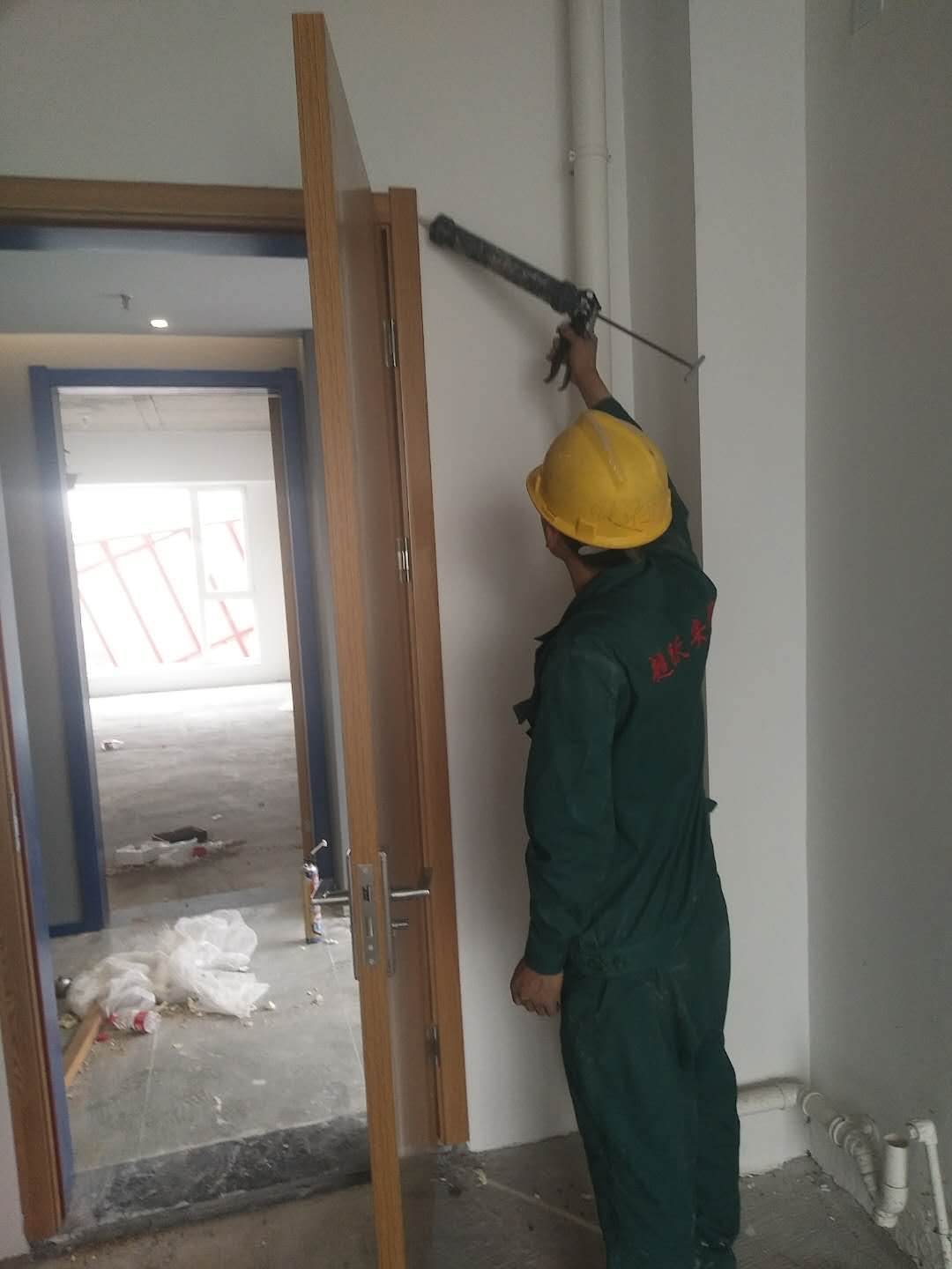 2018年5月6日工師傅們在實施***后一道工序打膠并打掃衛生。